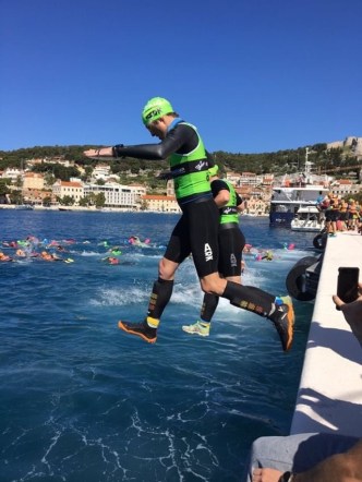 We soon found ourselves at the Castle overlooking Hvar and back on the course from last year. It was a long descent before reversing part of the last swim. We could see a mixed pair catching us on the run. The aim was to hit the swim at least with them as we must be quicker swimmers. On the final rise before descending to the swim we walk so I could get my wetsuit up and goggles on. The couple passed us here and then started to make a wrong turn ahead of us. Demonstrating our different competitive attitude, Rachel called their mistake (I’d have called it as I pass them!). We managed to start swimming ahead of them and pull out at least a 30s lead as we exited for the final 500m run.